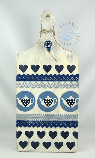 Deska drewniana duża, malowana farbami akrylowymi, postarzana, zabezpieczona lakierem wodnym. Koraliki drewniane. Ozdobny frez daje efekt ramki.
